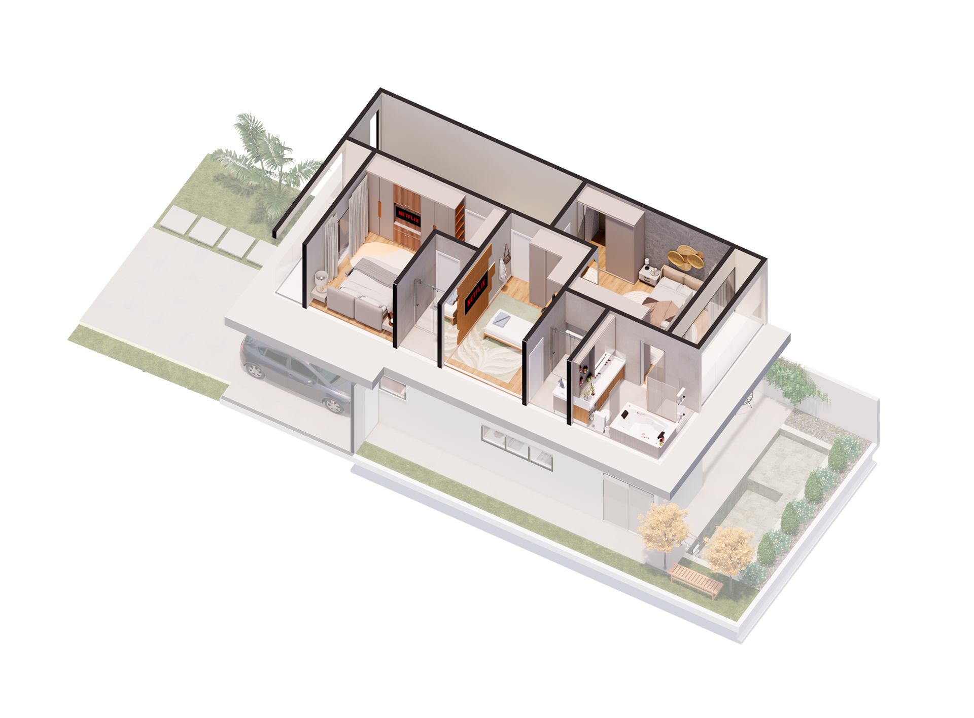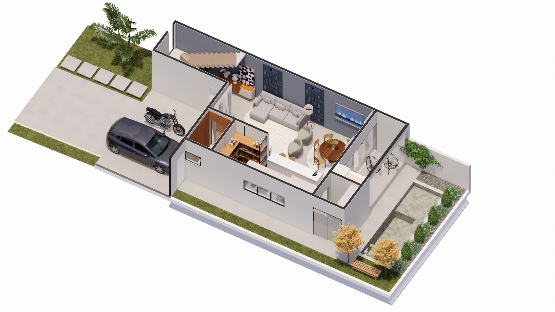 A Casa Jasmim foi pensada para quem valoriza conforto, funcionalidade e momentos especiais. Com ambientes integrados, a sala de estar, jantar e cozinha — que conta com uma prática despensa — criam um espaço amplo e acolhedor, perfeito para o dia a dia e para receber bem. O projeto inclui ainda lavabo, lavanderia e garagem coberta para dois carros.
