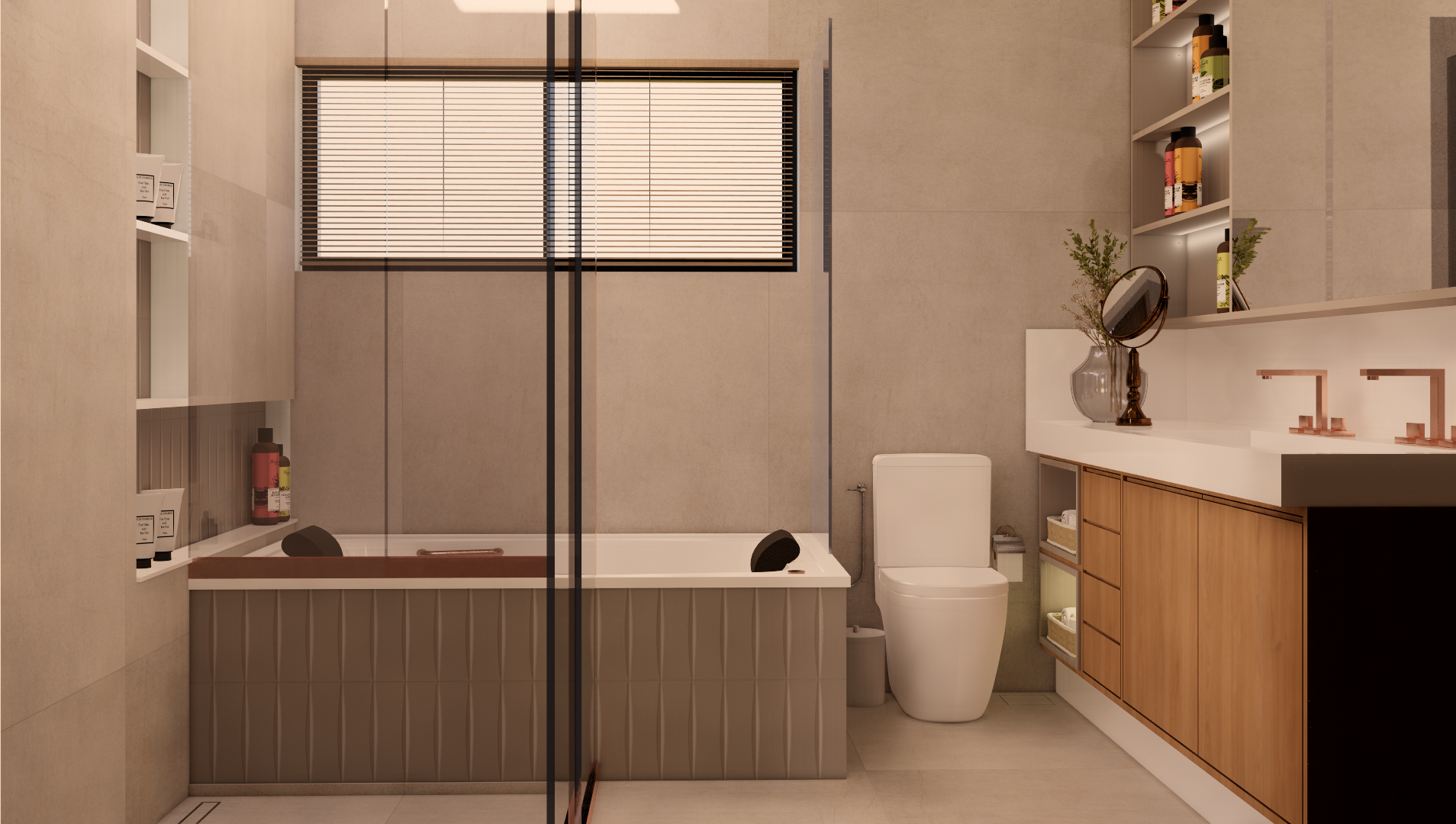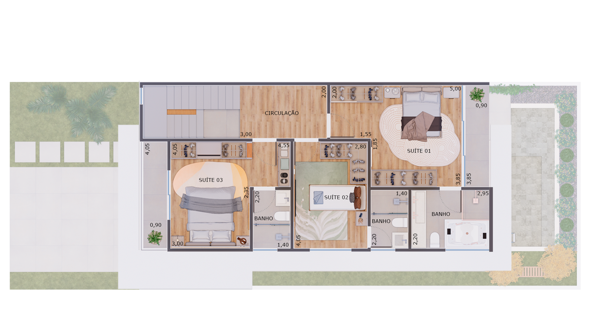 3 suítes espaçosas, sendo uma delas com banheira de imersão.