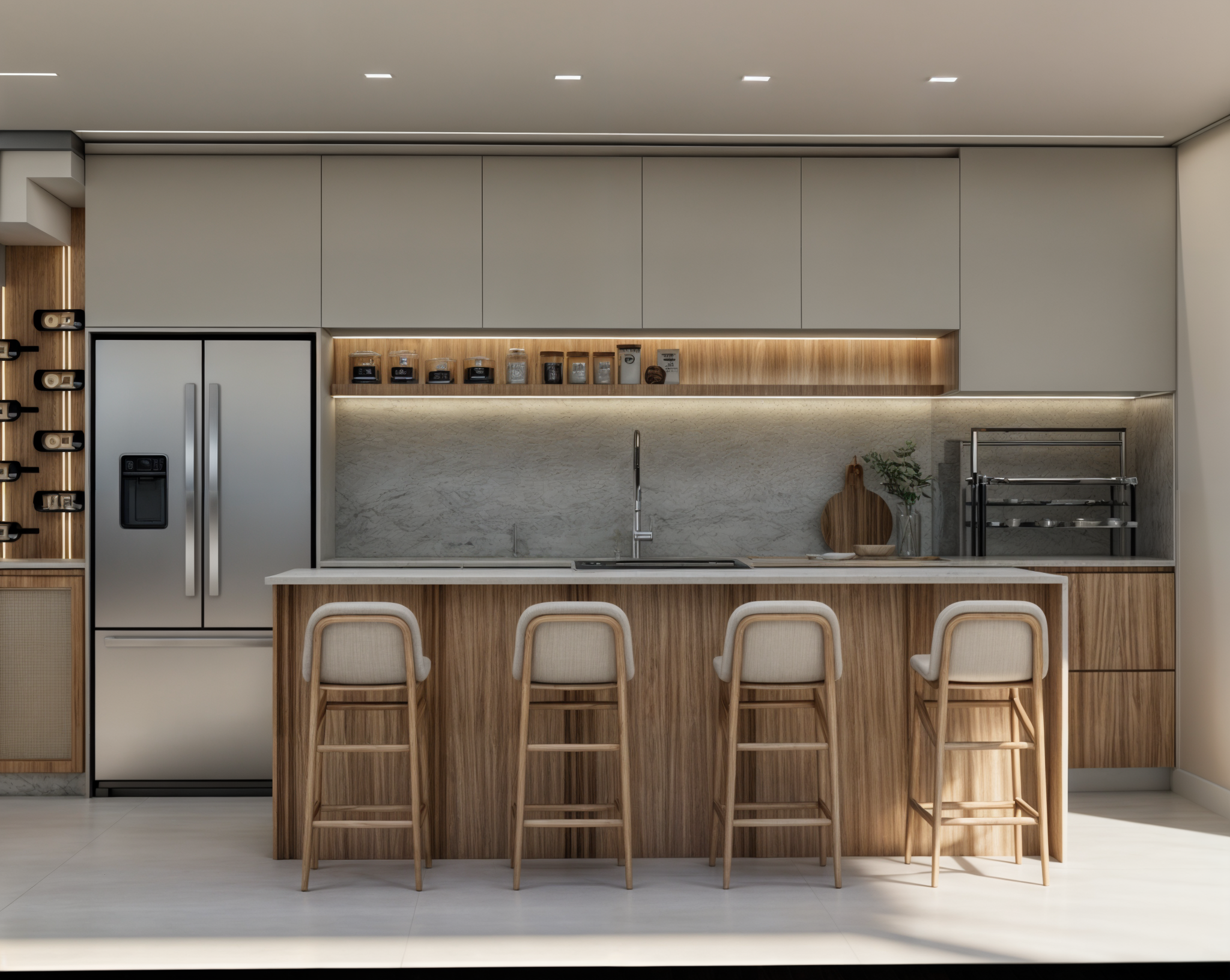 Ilha central, bancadas em quartzo e integração com área gourmet.