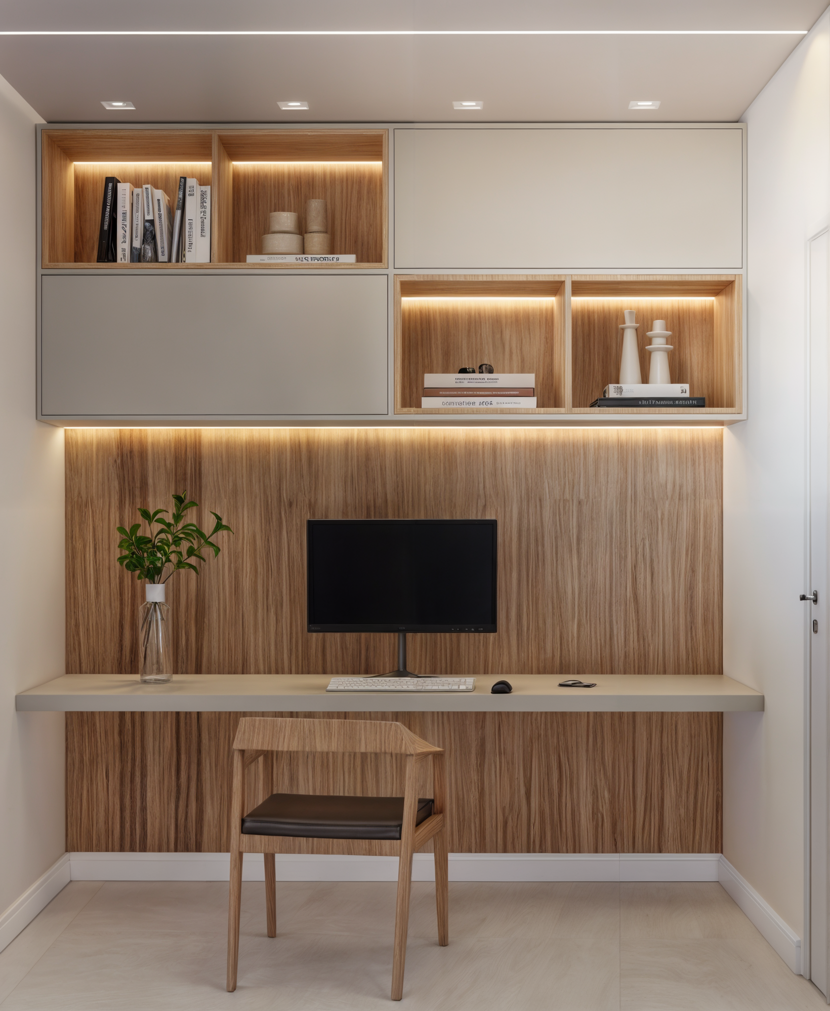 Escritório reservado e cozinha integrada com espaço de lazer.