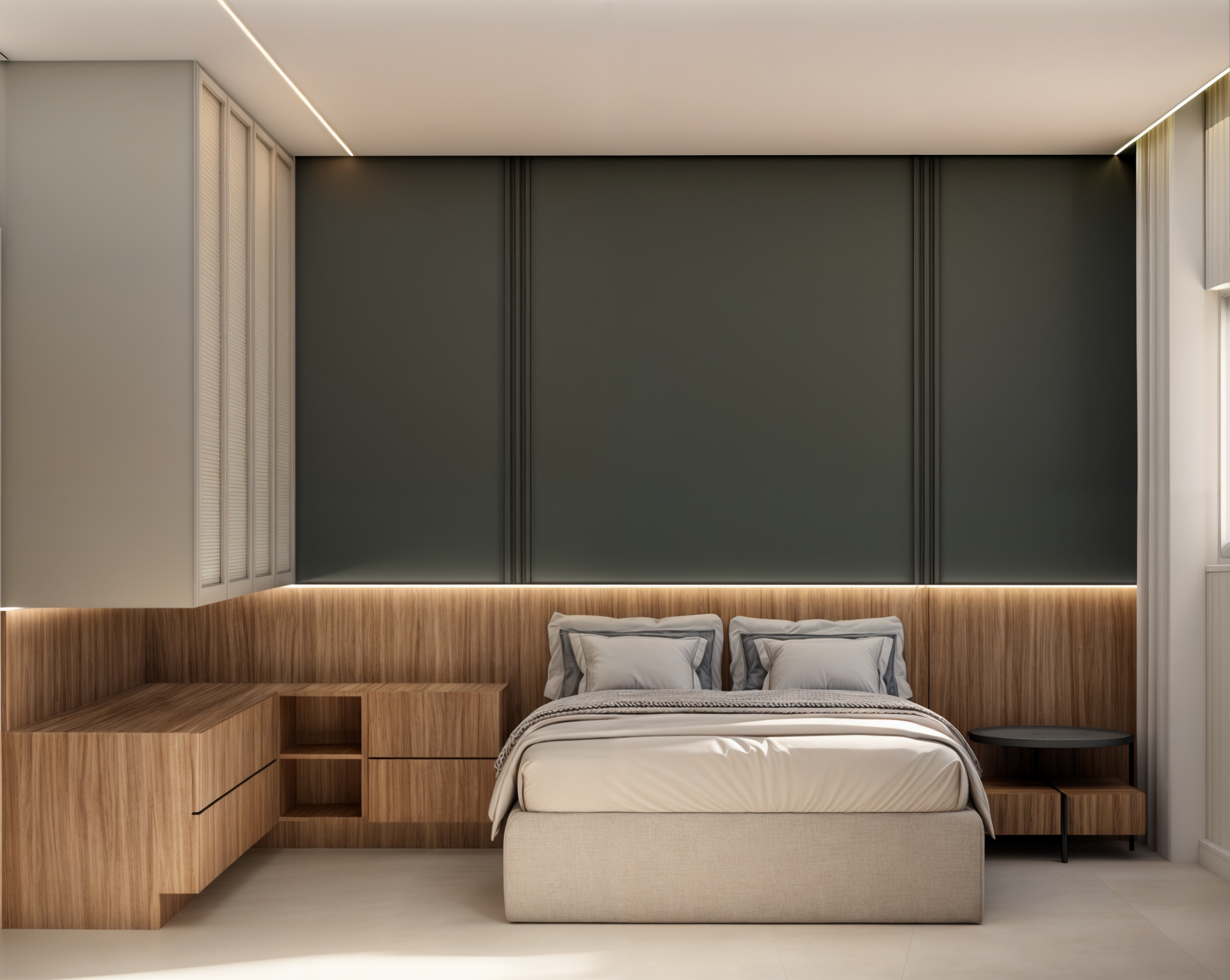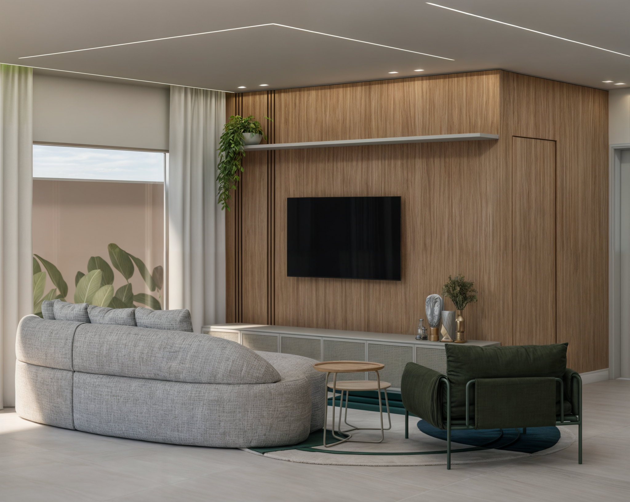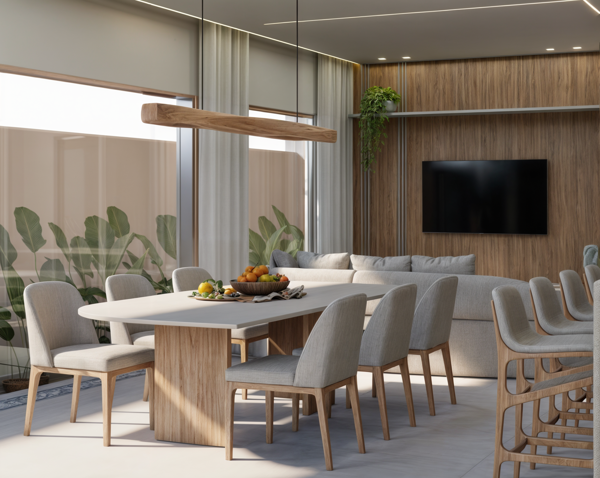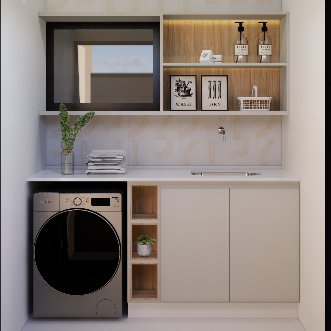 Com uma área social integrada que une sala de estar, jantar e cozinha, o espaço convida à convivência com praticidade e leveza.