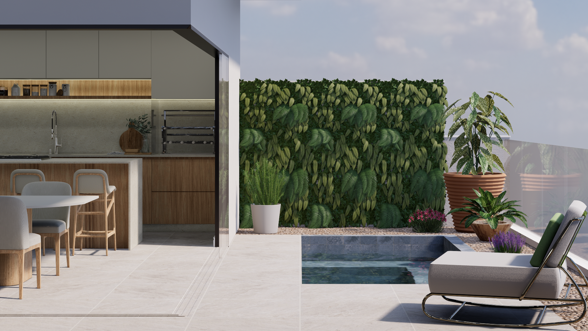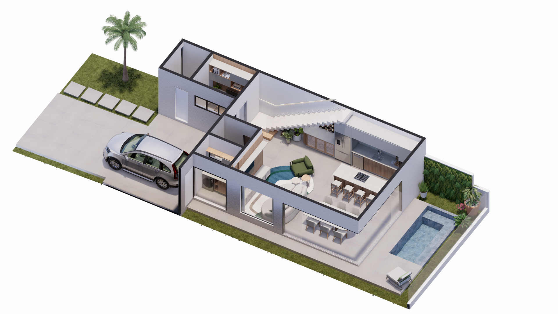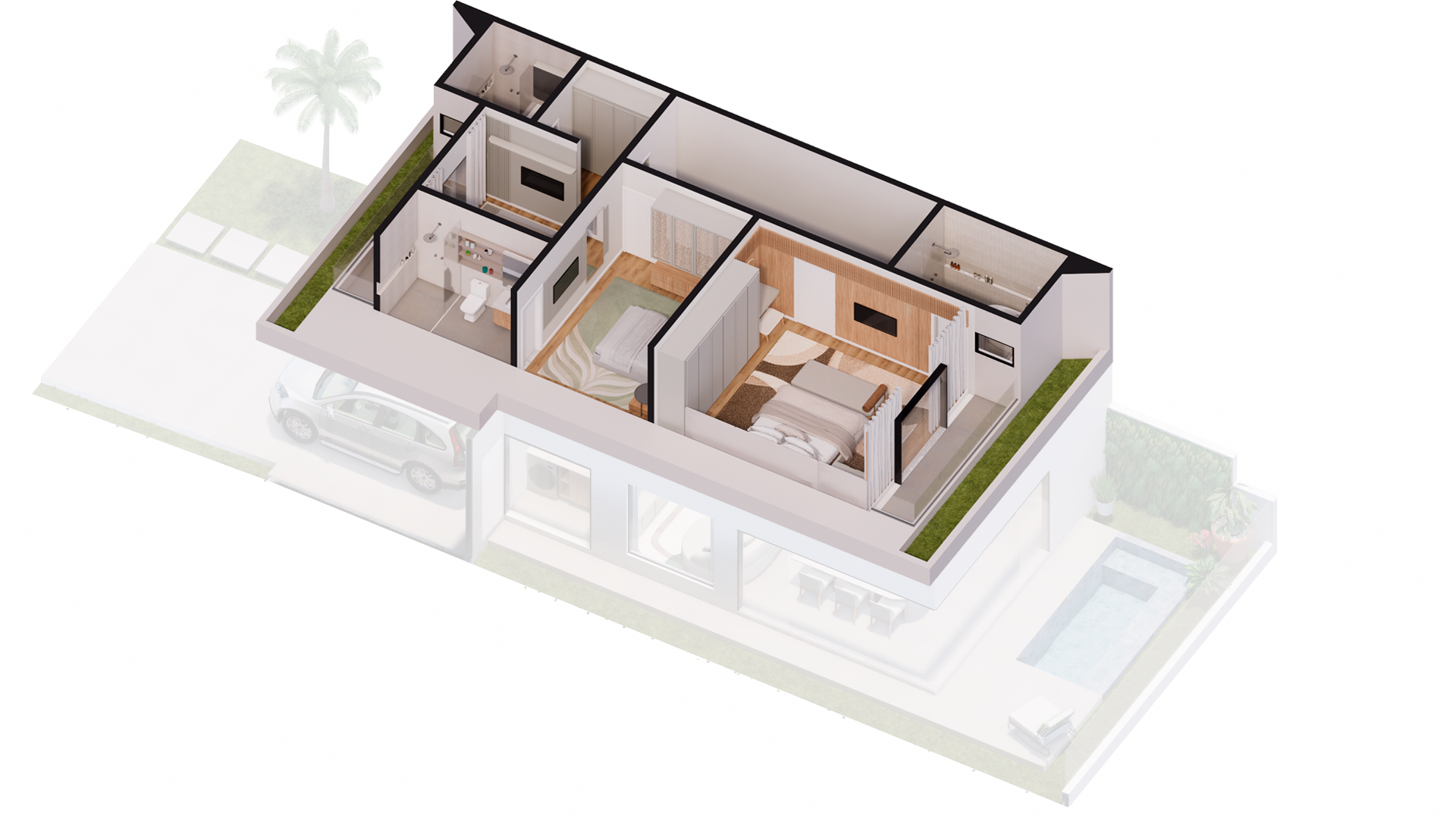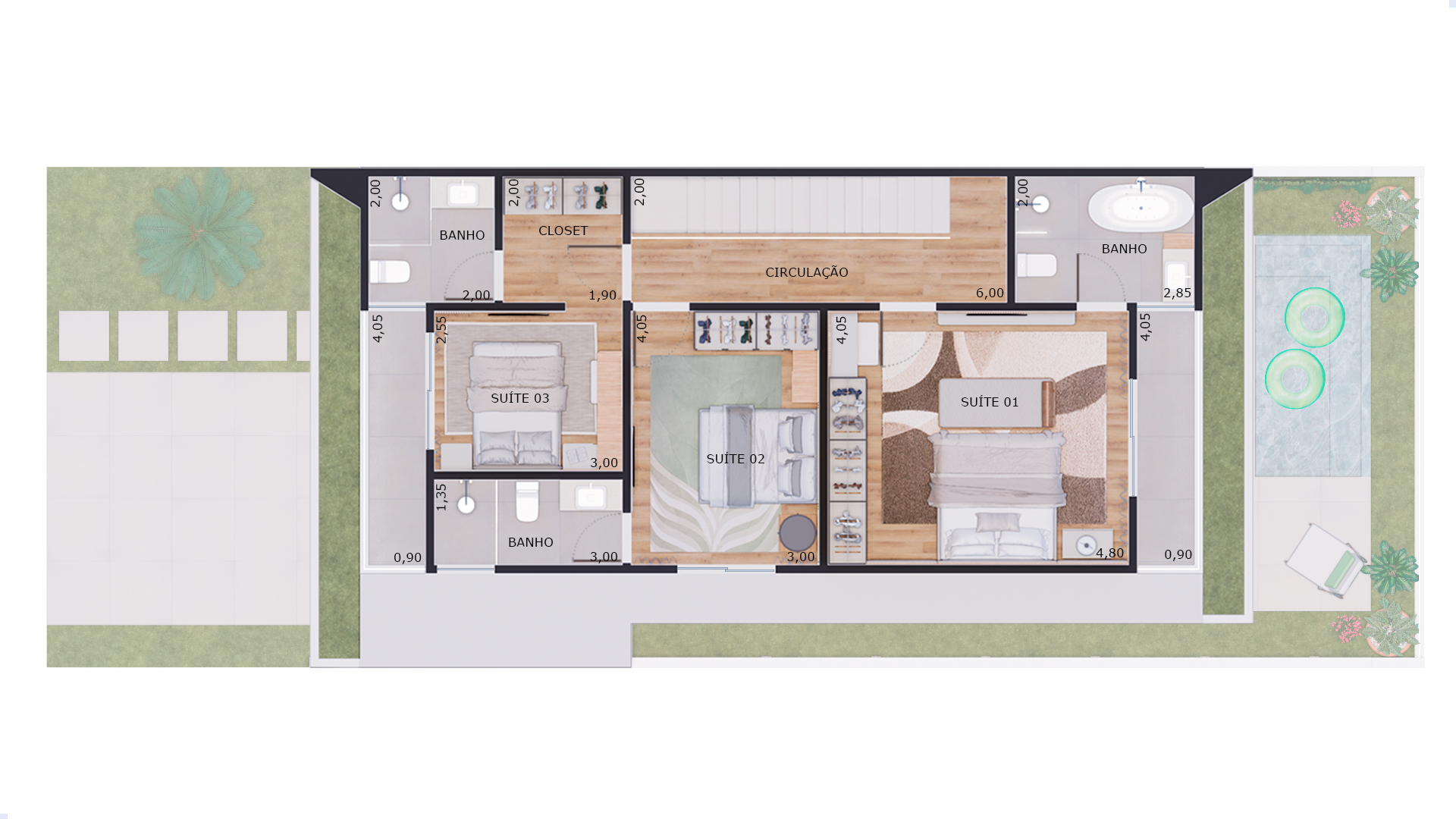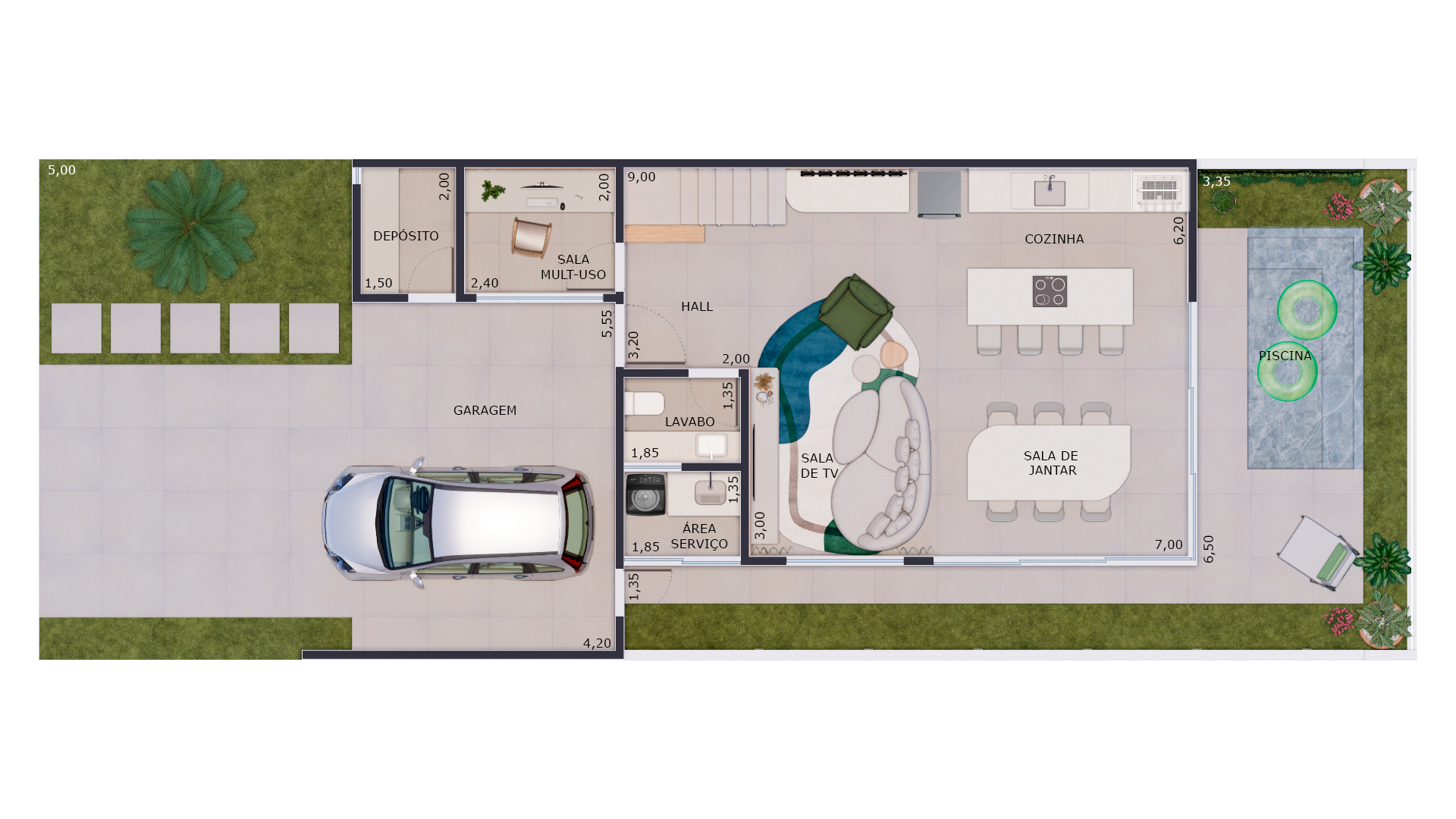 Na área íntima, as três suítes oferecem o equilíbrio perfeito entre privacidade e aconchego, ideais para descansar com tranquilidade. E para curtir os dias de sol, a área externa com piscina completa o cenário — perfeita para receber amigos ou relaxar em família.