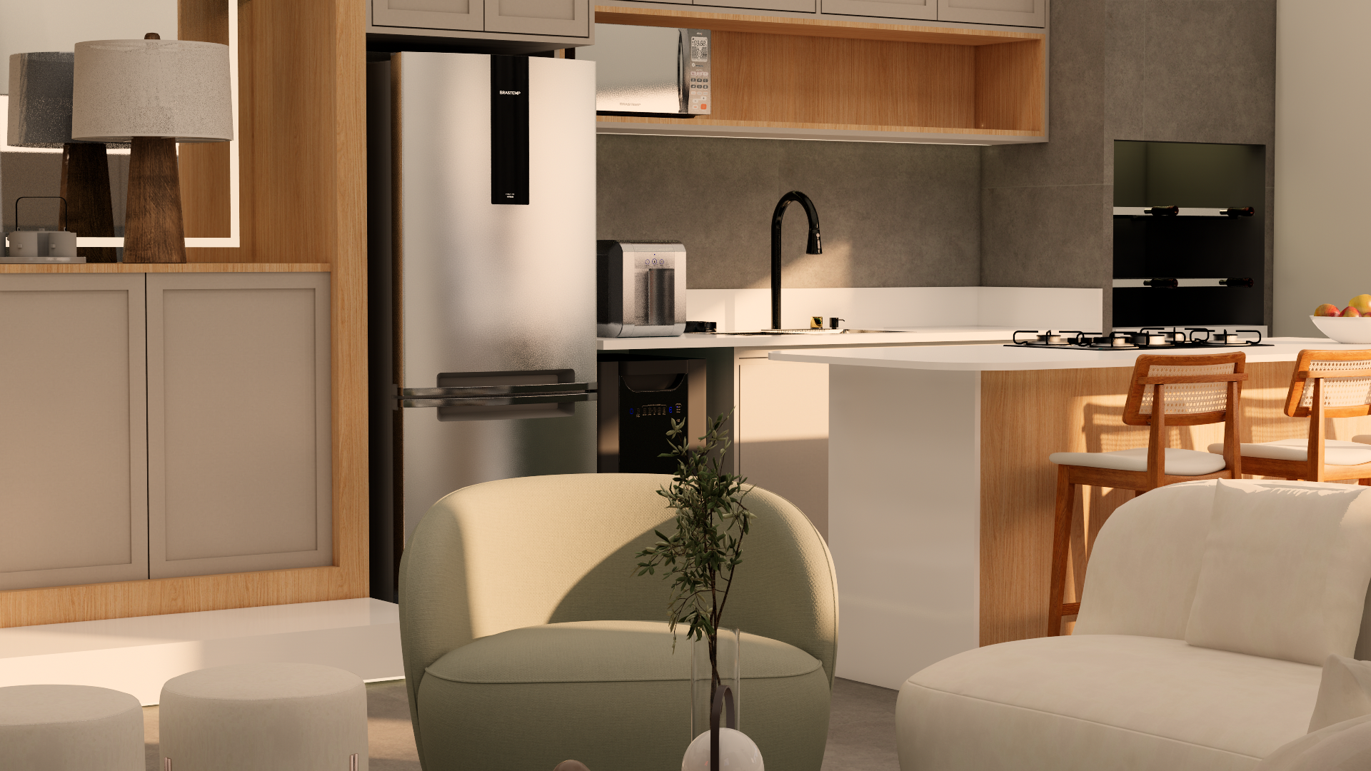 Cozinha integrada com espaço de lazer e ampla área de serviço.
